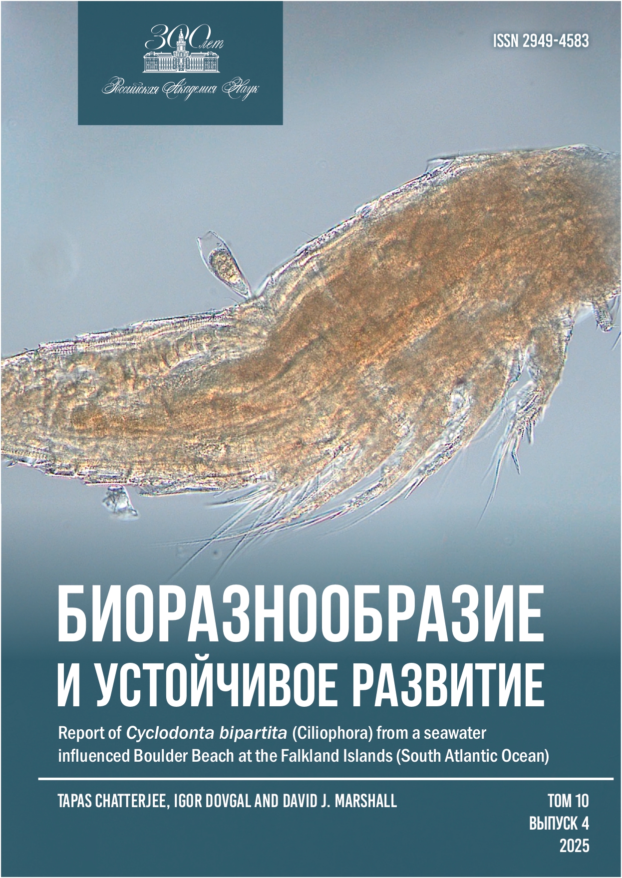 Чаттерджи Т., Довгаль И. В., Маршалл Д. Дж. Обнаружение Cyclodonta bipartita (Ciliophora) на подверженнном воздействию морской воды галечном пляже на Фолклендских островах (южная часть Атлантического океана) // Биоразнообразие и устойчивое развитие. 2025. Т. 10, № 4. С. 15-20. https://doi.org/10.21072/eco.2025.10.4.02